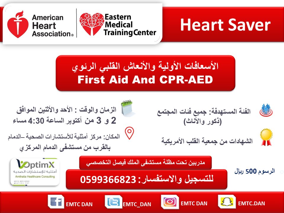 الأهلي الطبي Alahli Medical Sur Twitter يعلن مجمع الأهلي الطبي بحائل عن إقامة دورة انعاش القلب الرئوي Bls للمرة الثانية الشهادة صادرة من جمعية القلب الأمريكية و معتمدة من الهيئة