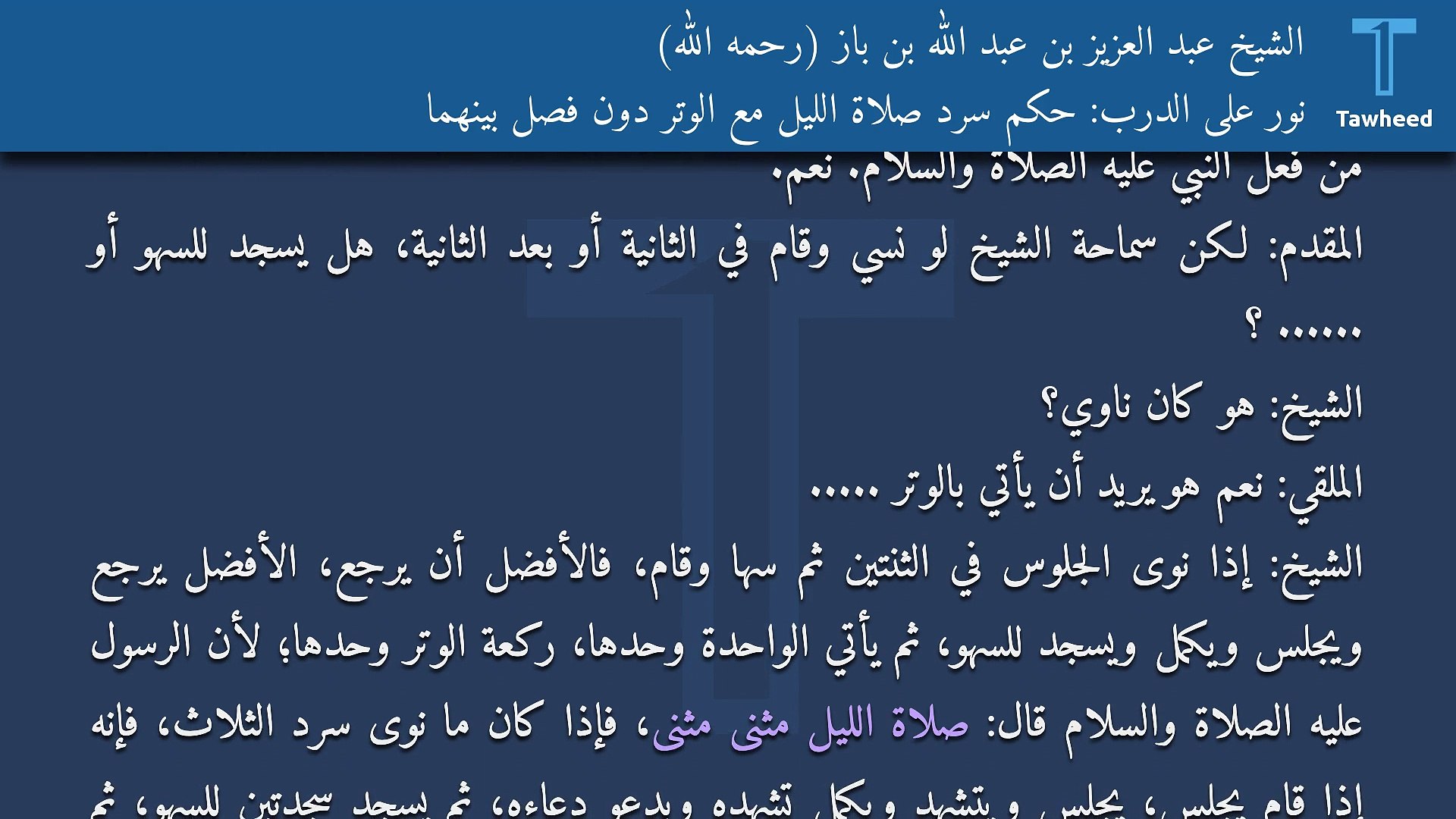 نور على الدرب حكم سرد صلاة الليل مع الوتر دون فصل بينهما الشيخ عبد العزيز بن عبد الله بن باز رحمه الله Video Dailymotion