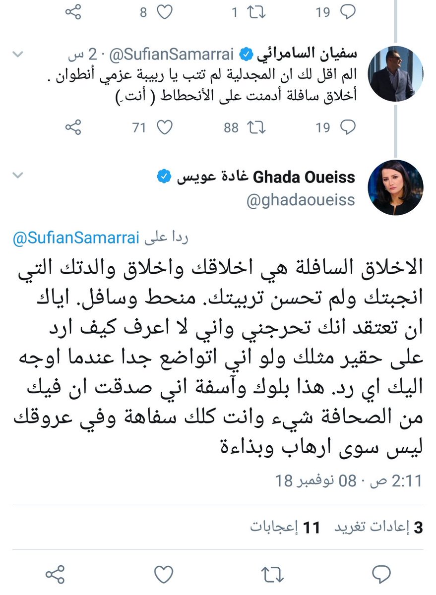 النـايــف Pa Twitter غادة عويس جدال عقيم للشتم ولم تكتفي بسبه عبارات نابيه مثل منحط سافل حقير بل وصلت لشتم والدته باخلاقها وتقول عن الشعب السعودي يستخدم الفاظ نابية تنهى عن خلق وتأتي بمثله
