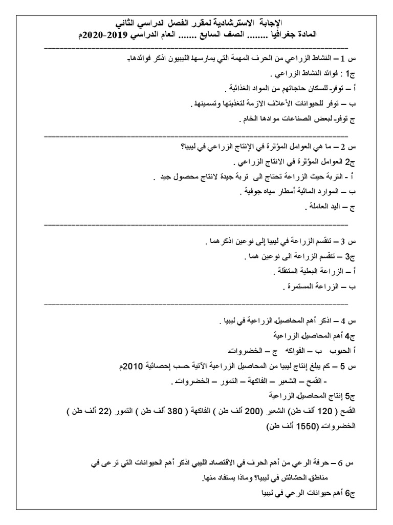 الاجابة النموذجية لأسئلة الجغرافيا للصف السابع Docx